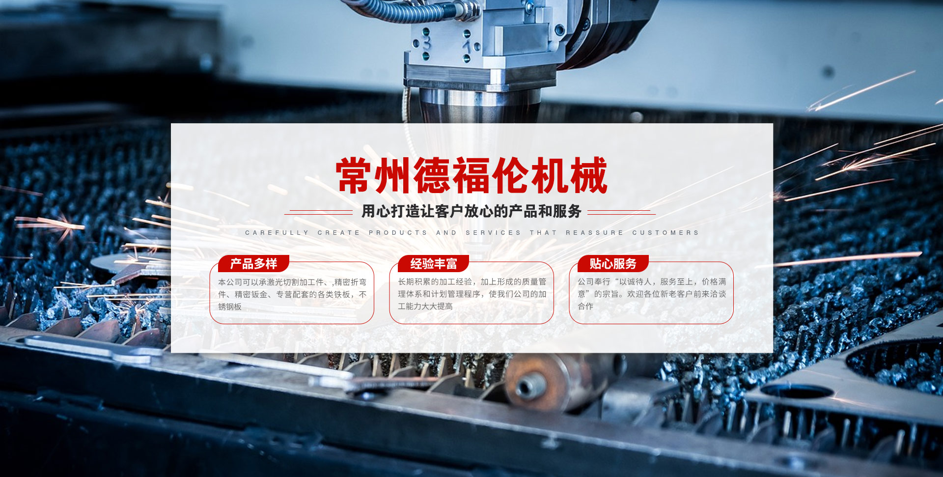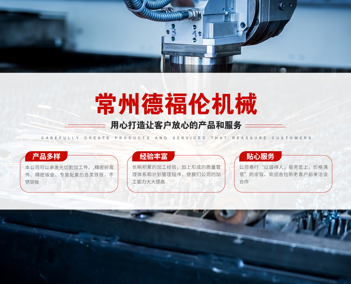 常州德福倫機(jī)械有限公司成立于2014年12月19號,位于江蘇省常州市武進(jìn)區(qū)遙觀鎮(zhèn)建農(nóng)村劍童路56號西門;公司配備;1萬瓦通K激光切割機(jī)1臺(tái),6千瓦領(lǐng)C激光切割機(jī)1臺(tái);機(jī)器行程6米*2.2米,切割不銹鋼50mm,碳鋼30mm;300噸大型數(shù)控折彎機(jī)。精密焊接機(jī)器數(shù)臺(tái)。本公司可以承激光切割加工件、,精密折彎件、精密鈑金、專營配套的各類鐵板,不銹鋼板。長期積累的加工經(jīng)驗(yàn),加上形成的質(zhì)量管理體系和計(jì)劃管理程序,使我們公司的加工能力大大提高,滿足客戶所需,是我們公司的目標(biāo)!公司奉行“以誠待人,服務(wù)為上,價(jià)格滿意”的宗旨。歡迎各位領(lǐng)導(dǎo);老總前來洽談合作!